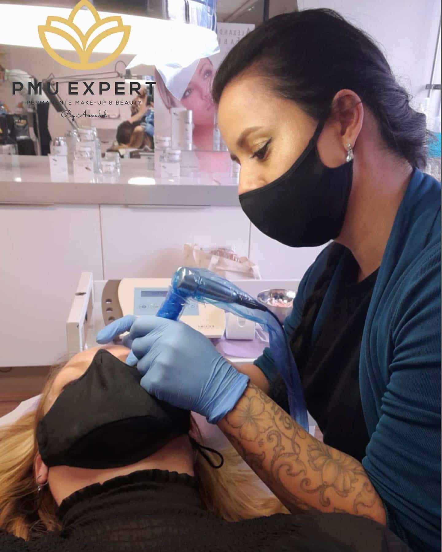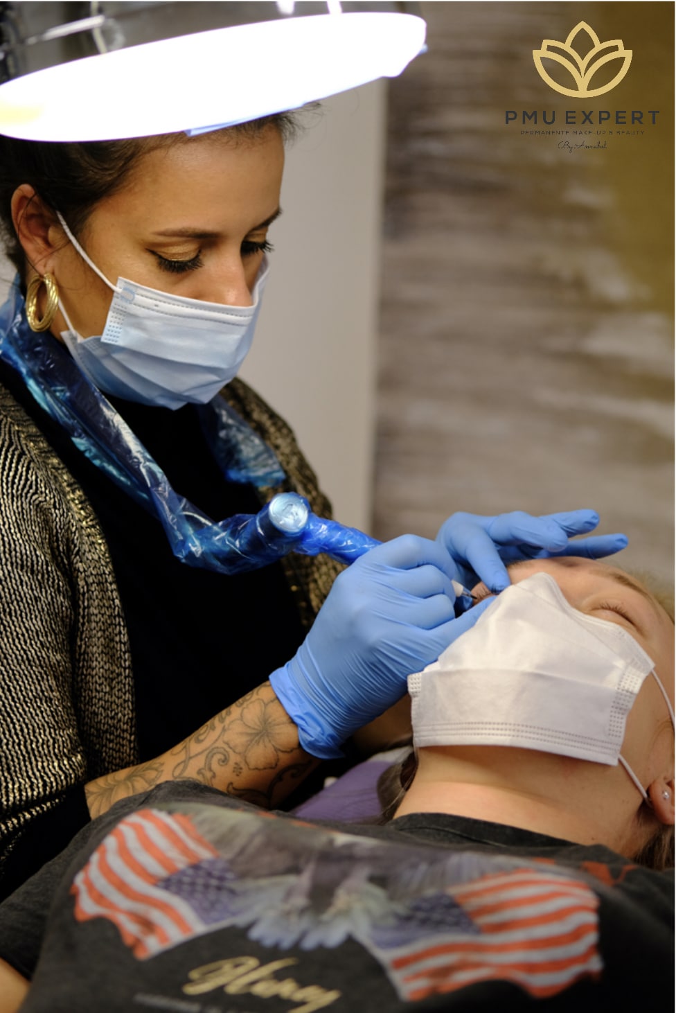 Permanente make-up eyeliner wordt toegepast door middel van een PMU apparaat met een naald module. Met kleine bewegingen wordt het pigment onderhuids aangebracht.